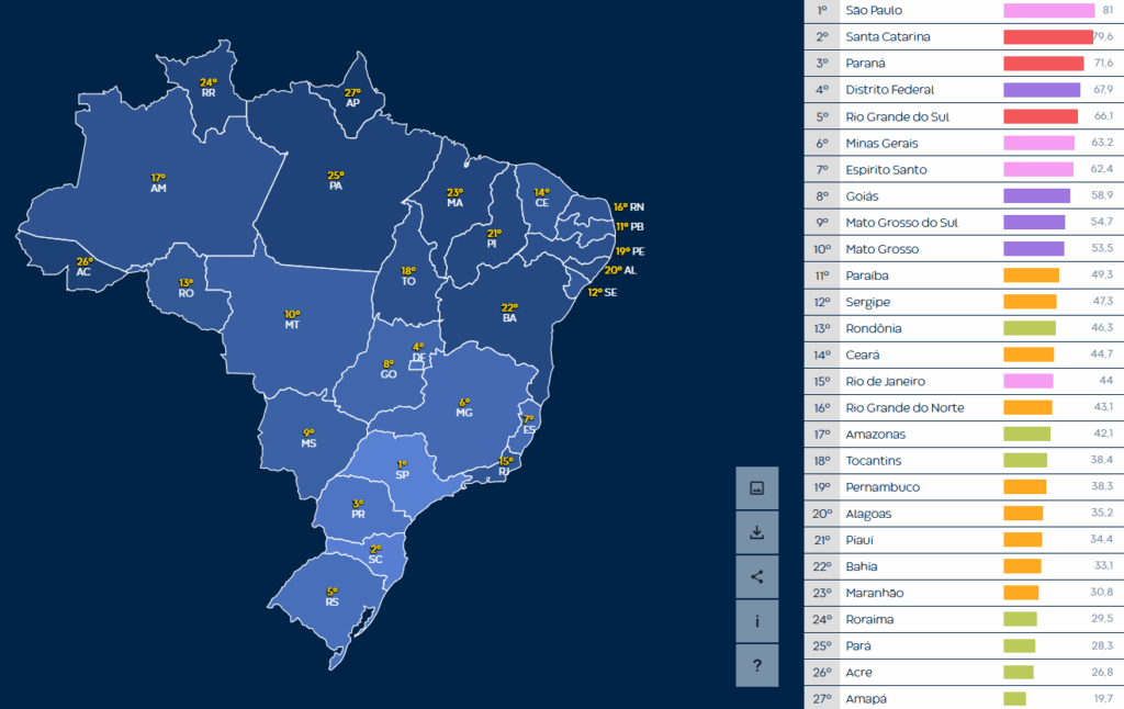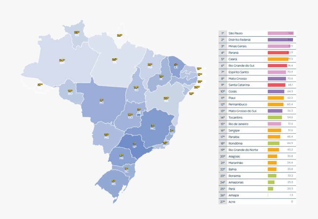Os indicadores que sustentam essa posição incluem taxas de matrícula no ensino médio e superior, IDEB, escolarização da população jovem e infraestrutura escolar — todos com resultados expressivos. Além disso, o estado mantém histórico de bom desempenho em avaliações externas e apresenta alta proporção de docentes com formação adequada, o que contribui diretamente para a qualidade da educação.