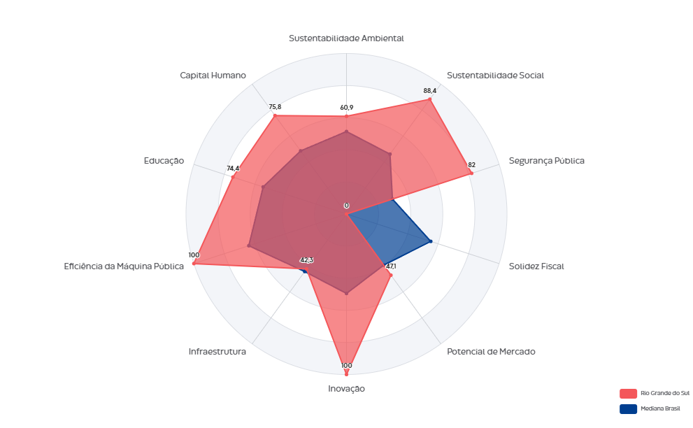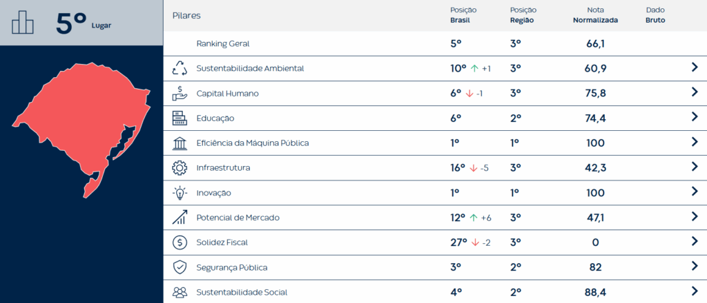 O mesmo ranking atribui notas em diferentes pilares como potencial de mercado, educação e inovação e o Estado do RS, em todos os indicadores, aparece em destaque especialmente por sua alta capacidade de atrair talentos e investimentos.