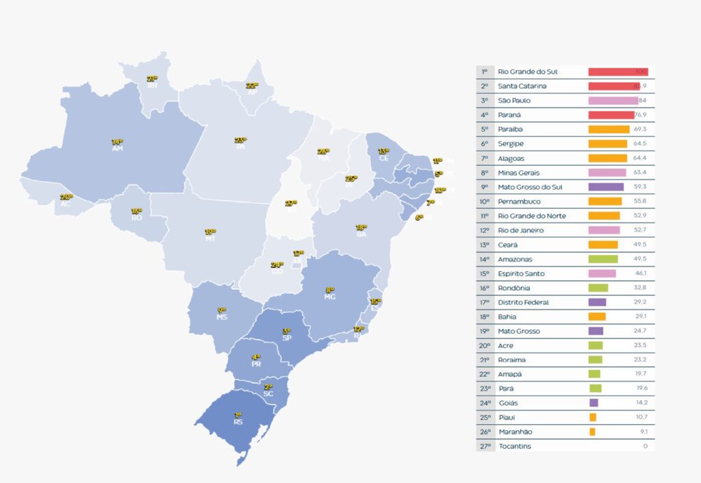 Vale ainda destacar, do mesmo estudo, o posicionamento do estado do RS no ranking Inovação, ressaltando indicadores como investimentos em Patentes, Bolsa de Mestrado e Doutorado estrutura de Apoio à Inovação e Pesquisa Científica, estando melhor ranqueado entre os estados da federação.